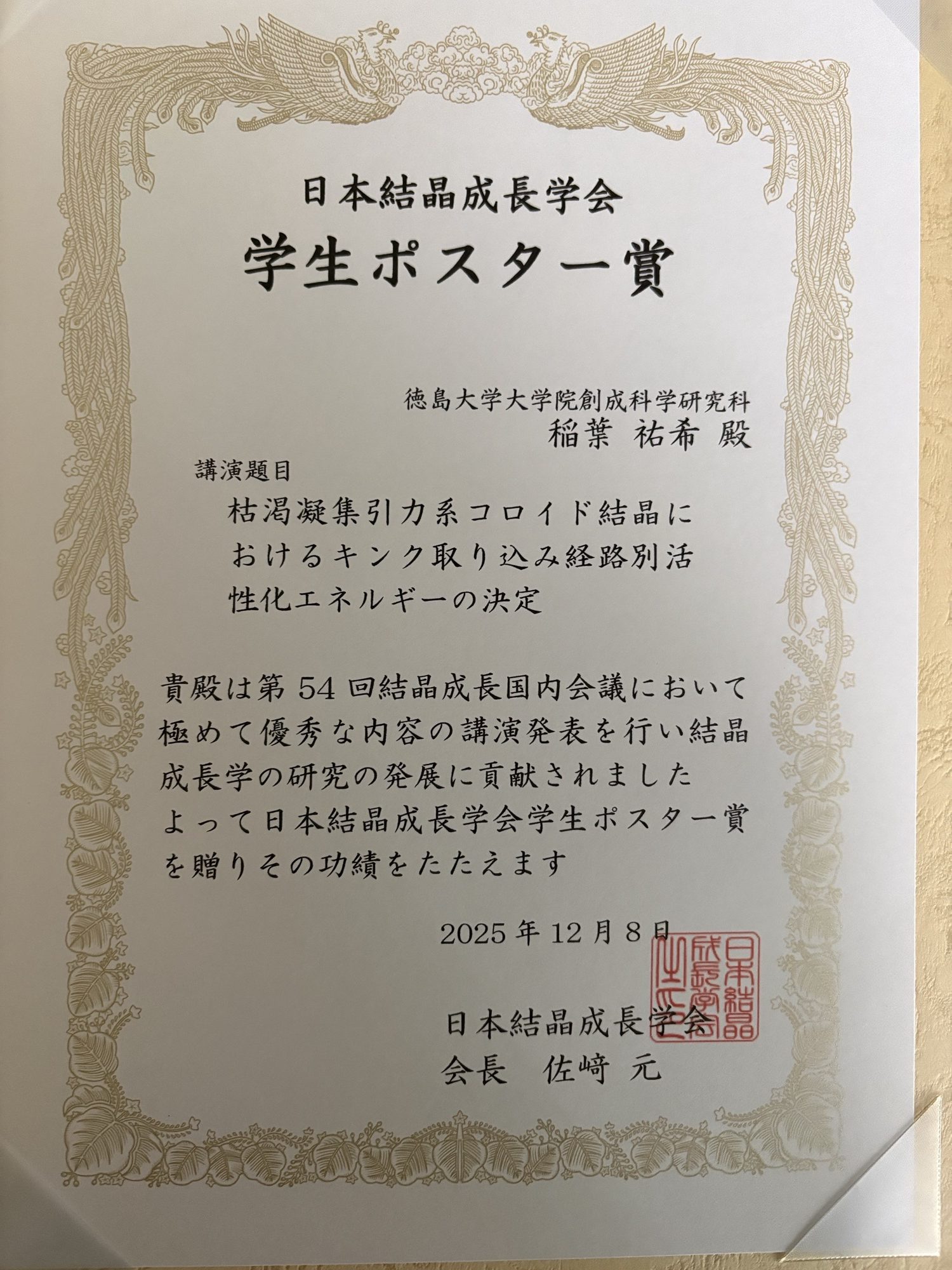 2025年12月8日 / 最終更新日時 : 2026年1月5日 chem 受 賞 第54回結晶成長国内会議(JCCG54)で稲葉祐希さんが学生ポスター賞を受賞 2025年11月12~13日に開催された第54回結晶成長国内会議(JCCG54、金沢商工会議所会館)で化学B-4講座の稲葉祐希さんが優秀ポスター発表賞を受賞しました。 受賞論文題目・発表者は以下の通り: 受賞論文題目:枯渇凝集引力系コロイド結晶におけるキンク取り込み経路別活性化エネルギーの決定 発表者:〇稲葉祐希,鈴木良尚,佐藤正英